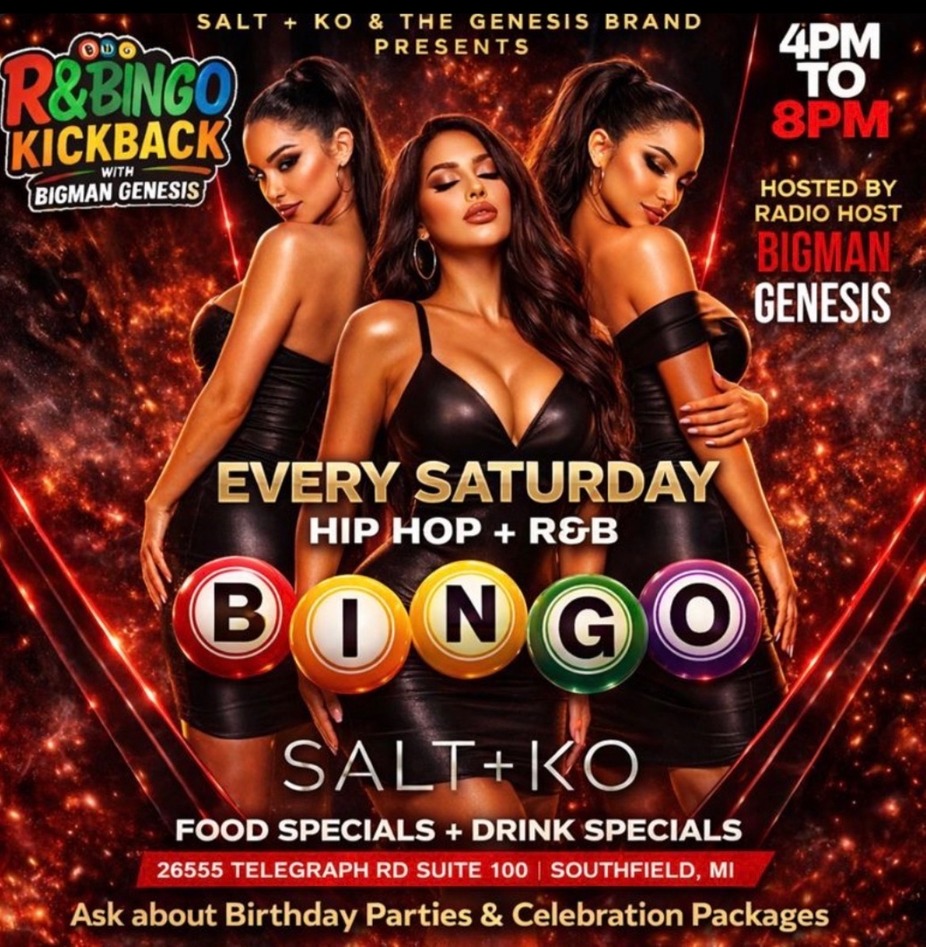Detroit energy meets classic competition at our R&B Bingo + Karaoke Day Party. Hosted by radio personality Bigman Genesis, this high-energy experience blends Hip Hop & R&B anthems, crowd sing-alongs, bingo games, and nonstop vibes. Expect food and drink specials, prizes, and a grown-and-sexy atmosphere that keeps the party moving all afternoon. Come early, bring your crew, and rep Detroit the right way.