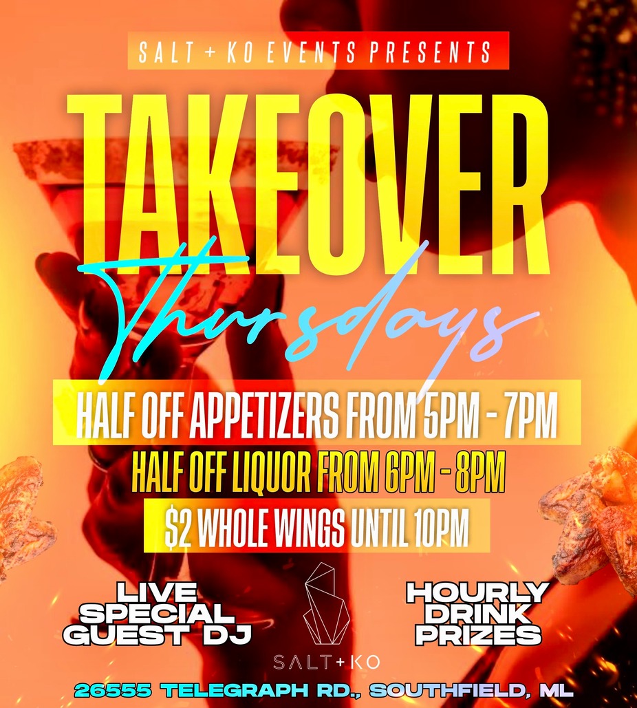 Thursdays belong to the bold. Takeover Thursdays brings high-energy nightlife with unbeatable specials and great music setting the tone. Enjoy half-off appetizers 5-7pm, half-off liquor, and $2 whole wings as the night heats up. With hourly drink prizes and nonstop vibes, Takeover Thursdays is where the weekend starts early at Salt + Ko.